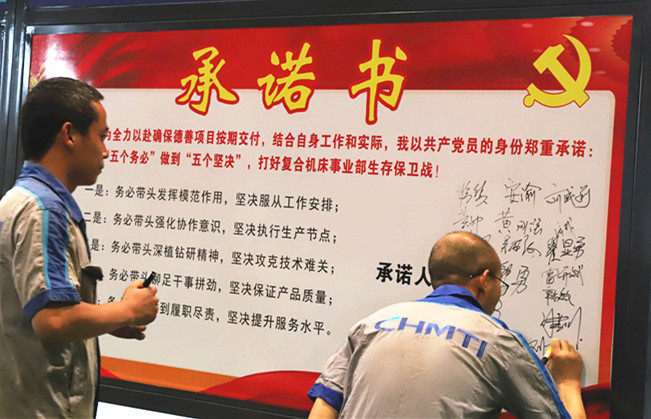 随后,复合机床事业党支部党员吴西德代表发言。他表示德善项目交期短、任务重,事业部全体党员和职工将坚定信心、树立决心,以责无旁贷的使命感、以时不待人的紧迫感、做逆势而上的担当者和强有力的执行者,以饱满的热情投于项目,确保按期保质保量交付,全力以赴打赢这场攻坚战!